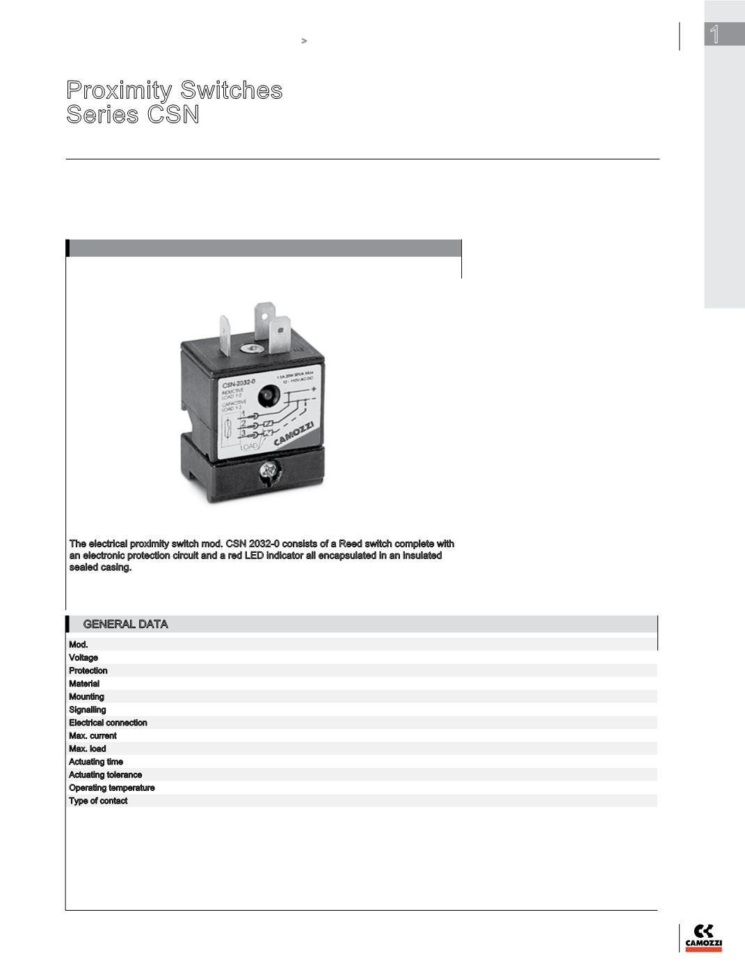 The electrical proximity switch mod. CSN 2032-0 consists of a Reed switch complete with
